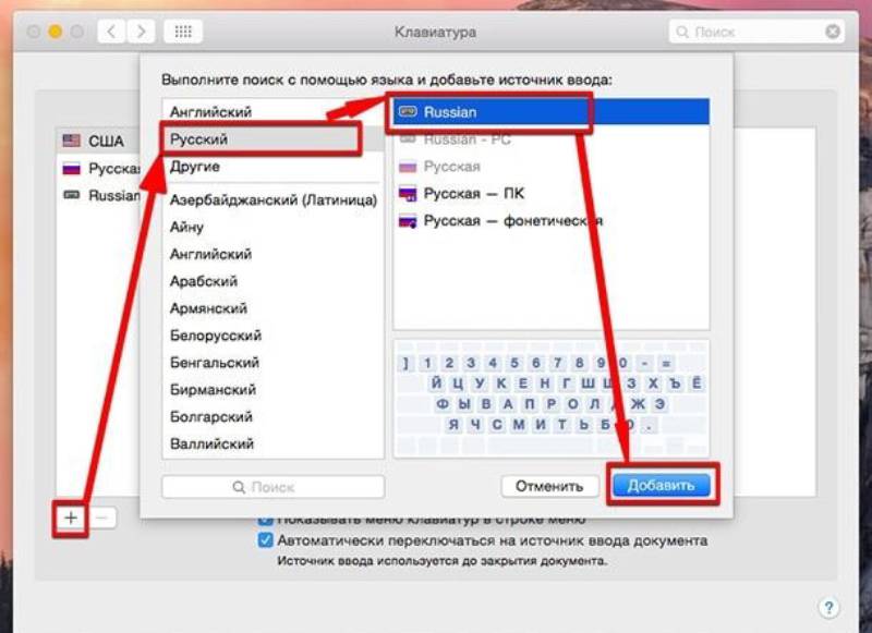 Решение: идём в «Системные настройки» → «Клавиатура» → «Ввод текста» → «Изменить». Нажимаем на плюс и добавляем раскладку «Русская — ПК». Это классика.
